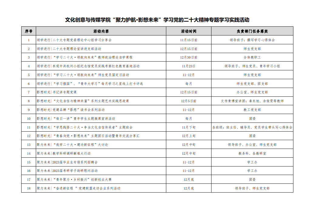 全覆盖宣讲,全媒体宣传。扎实推进习近平新时代中国特色社会主义思想和党的二十大精神进教材、进课堂、进头脑,把党的二十大精神作为学校思想政治教育和课堂教学的重要内容,持续打造思政金课,以文传青博团打造“文化自信与精神共富”系列主题艺术实践思政课。组织开展学习党的二十大精神示范微党课,书记带头讲党课。党的二十大精神青年学习交流日和读书沙龙等丰富多彩的线上线下学习活动,办好“影想”读书会系列活动。组织党员干部、青年学习小组以校地联建、宣讲采风、口述研学等形式,深入习近平总书记调研指导过的地方,开展现场学习、实地访谈,组织“每日一讲”青年学生主题微课宣讲活动;分享“青春向党·影想未来”主题团日活动暨青年交流学习汇;召开“学思践悟二十大·争当文化自信传承者”主题班会组织撰写学习党的二十大报告心得体会,由班主任、辅导员领头写、学生党员和学生干部带头写,人人有感悟,人人有宣讲,形成线上线下联动,师生全员同学共讲的良好局面。