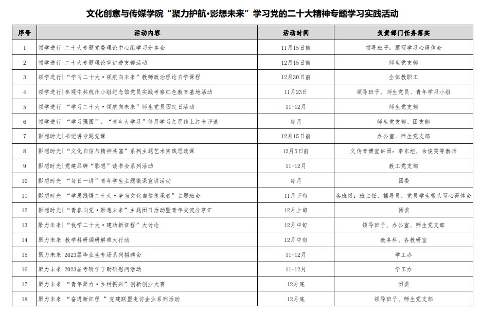 事事调研解难,人人争先践行。围绕党的二十大精神,结合浙江、杭州的丰富实践成果,充分发挥文传学院艺术文化学科优势,紧扣“乡村共富”主题,进行系统深入地研究、阐释、解读,加强理论研究与调查研究相结合,聚焦党的二十大提出的新思想、新观点、新论断,邀请一批高水平专家深入展开阐释研讨活动,加强学术平台建设,召开座谈会,发表理论文章,组织申报一批思政课题研究,开展提升党建工作质量专题大讨论,做强做优做大“影想”党建品牌建设。聚焦新使命、新任务,以师生党支部为单位,针对师生关注的热点难点问题深入开展教学科研水平调查研究,聚力攻坚为师生解决实际困难。针对高校学生就业难问题,举办好2023届毕业生专场系列招聘会、2023届考研学子助研慰问活动、“青年聚力·乡村振兴”创新创业大赛、“奋进新征程·访企拓岗 ”党建联盟走访企业系列活动。进一步激励师生比学赶超,推动学习实践活动走实走深,将学习宣传贯彻党的二十大精神转化为推动教书育人、学术科研、服务地方等各方面工作高质量发展的强大动力,贡献师大文传智慧。