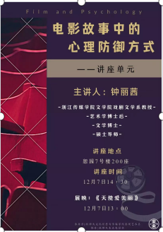 12月7日下午,由浙江传媒学院文学院戏剧文学系教授钟丽茜老师主讲的讲座“电影故事中的心理防御方式”在恕园7号楼200座成功举行。本次讲座由影视艺术系主任何明燕老师主持,各学院研究生、本科生来到现场观看讲座。