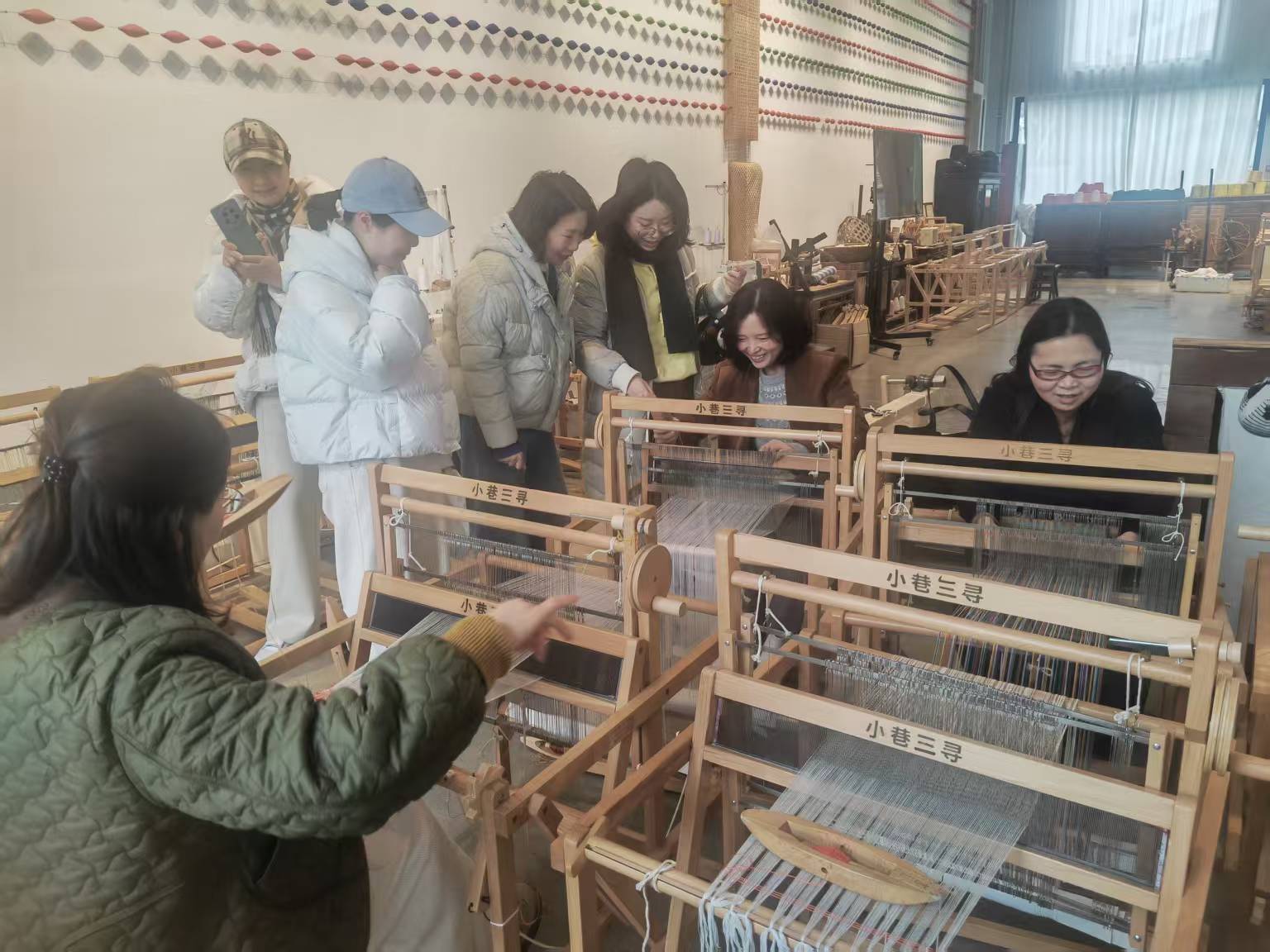 活动中女教工开展纺织乐工作坊,体验纺织穿梭的快乐。全体教工参观溪口村农历博物馆、乡村文创建设。