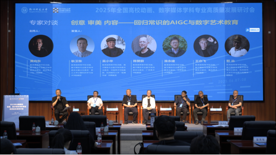 论坛深度聚焦教育链与产业链衔接,推动校企共建“三位一体”育人机制。下午的圆桌论坛分为“专家对谈”与“行业对话”两场,其中“专家对谈”由教育部高等学校动画、数字媒体专业教学指导委员会委员、西安美术学院黄向东教授主持,邀请了六位教育部高等学校动画、数字媒体专业教学指导委员会委员,浙江大学耿卫东教授、中国美术学院吴小华教授、广州美术学院陈赞蔚教授、北京林业大学淮永建教授、鲁迅美术学院王亦飞教授、开车漫画 郭冶教授,他们围绕“创意、审美、内容——回归常识的AIGC与数字艺术教育”展开对话并形成了共识,讨论反思了AI生成作品的评估标准、学生就业方向等现实问题,提出以“人机共生”理念推动学科与产业的双向突破,呼吁教育回归人文内核,避免技术异化创作。
