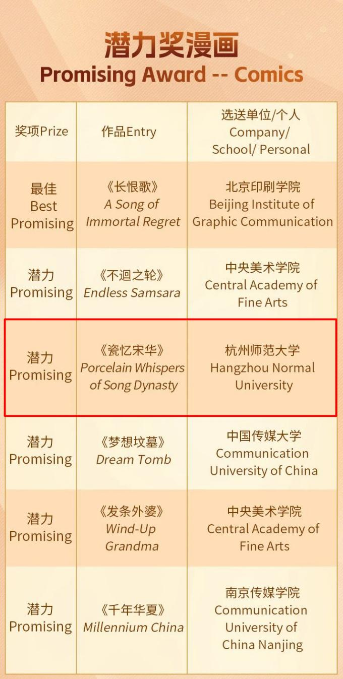 第二十一届中国国际动漫节“金猴奖”大赛颁奖仪式在浙江杭州举行,本届大赛自3月17日启动全球征集以来,共吸引了来自中国、法国、俄罗斯、美国、德国、西班牙、阿联酋等20个国家和地区的上千部原创动漫作品参赛,其中108部作品入围终评,并在激烈的角逐中,最终有35部优秀原创动漫作品脱颖而出,斩获殊荣。我校开车漫画 动画214班学生叶婧萱创作的绘本作品《瓷忆宋华》获得潜力奖漫画,动画214班学生曾云鑫创作的绘本作品《西厢记》入围潜力奖漫画。